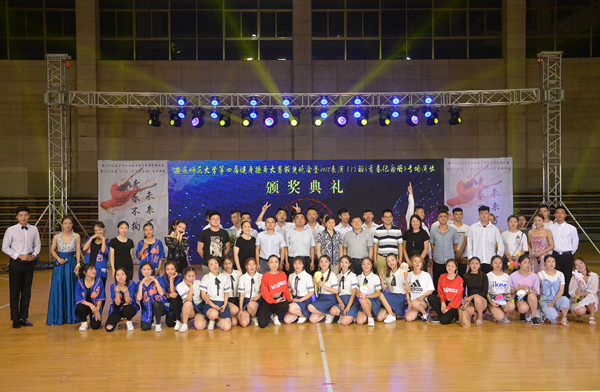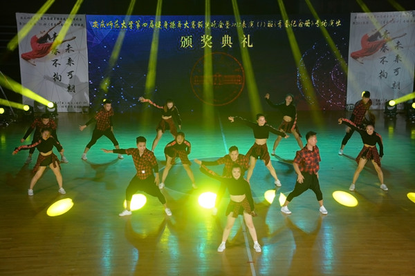 临近晚会尾声,在座领导依次上台为参与第四届健身操舞大赛的各学院舞蹈队颁发奖项,并与获奖团队合影留念。晚会在全体成员合唱的歌曲《相亲相爱》中落下帷幕。