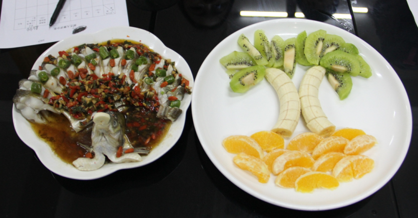 此次比赛以小组为单位展开,共分为两个环节:烹饪技能环节和营养知识竞答环节。比赛现场参赛队员们各显身手,菜品创意各具风格,摆盘造型也是丰富多样。第一环节是烹饪技能环节。要求参赛队在规时间内,制作出色香味俱全的菜肴和水果甜点,随后每组派一名选手介绍作品的寓意。菜肴制作环节结束后,“孔雀开屏鱼”、“鲫鱼豆腐”、“值得啃的鸡”、“菠萝炒饭”、“ 红烧鱼”、“糖醋排骨”等菜品的呈现,让人在没有品尝之前就已经大饱眼福。第二环节是营养知识竞答环节,每组选派另一名选手回答问题,每组有一次求助机会。答题所获得的积分决定每队在水果拼盘时取用水果的顺序,并计入总分。在最后一轮水果拼盘环节中,各队的拼盘创新独特,一道道精美绝伦、富有创意的水果拼盘着实让观众和评委赞叹不已。最终,经过评委们公开公正的评分,“选择题全队”荣获一等奖;“标悍外联队”获得二等奖;“四大胃王”获得三等奖。