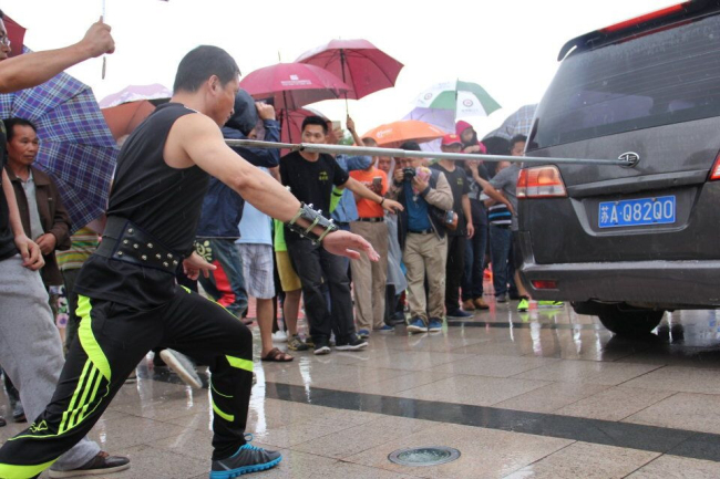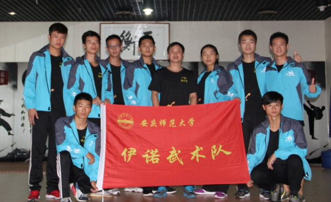 9月14日下午,武术队的队员们坐了4个多小时的大巴来到南京,马不停蹄的开始彩排以及适应场地。但天有不测风云,第二天当队员们摩拳擦掌准备登上舞台的时候,南京下起了连绵细雨。突来的大雨丝毫没有影响队员们的热情,雨中武旗,雨中太极,雨中双截棍等等项目有条不紊接连上场。由于雨水的影响,双截棍和舞棍出现了一些失误,但是仍压不住整体节目的精彩程度,观众掌声雷动,一片欢呼叫好,其中我院2014级体育教育专业葛震与休闲体育专业伍杨的金枪锁喉与安庆太极拳名师程俊峰老师金枪顶汽车的表演,均令场下观众和主持人目瞪口呆,惊叹不已。