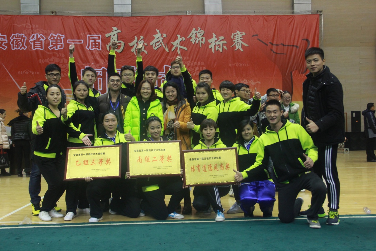 2015年12月11—13日,由安徽省高等院校教师教育合作委员会主办的安徽省第一届高校武术锦标赛在阜阳师范学院举行。共有来自安徽师范大学、淮北师范大学,安庆师范学院等10所高校的近百名运动员参加,开创了安徽省大学生武术交流学习的先河。我校代表队在许贵泉、胡哲纯、张书军、王思乐四位老师带领下,参加了体育专业组(乙组)与公体组(丙组)两个组别的比赛。