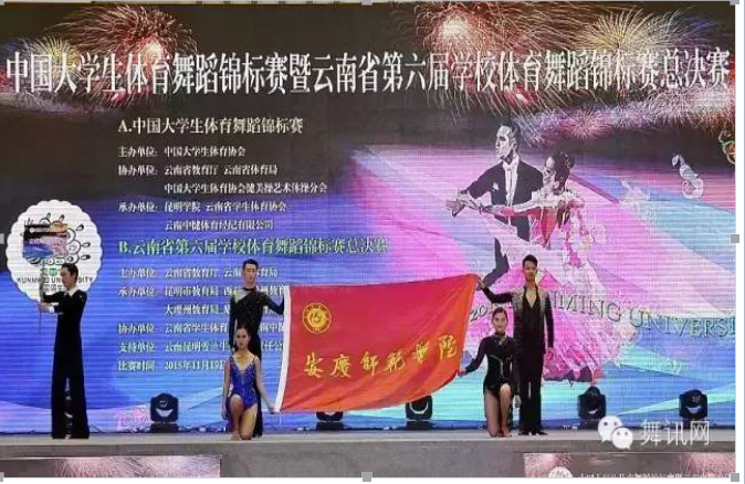 11月20至22日,2015中国大学生体育舞蹈锦标赛在春城昆明隆重举行,来自六十三所大学的近千名选手参加了赛事。我校以体育表演专业学子组成的体育舞蹈代表队在夏尚群和汪洋老师的带领下,经过为期两天的激烈竞争,取得了全国综合类大学专业组拉丁队列舞第一,艺术双人舞第二,团体舞第五,规定套路第四和第五以及众多单项赛前八名的骄人成绩。安庆师范学院代表队还被组委会授予“优秀组织奖”。