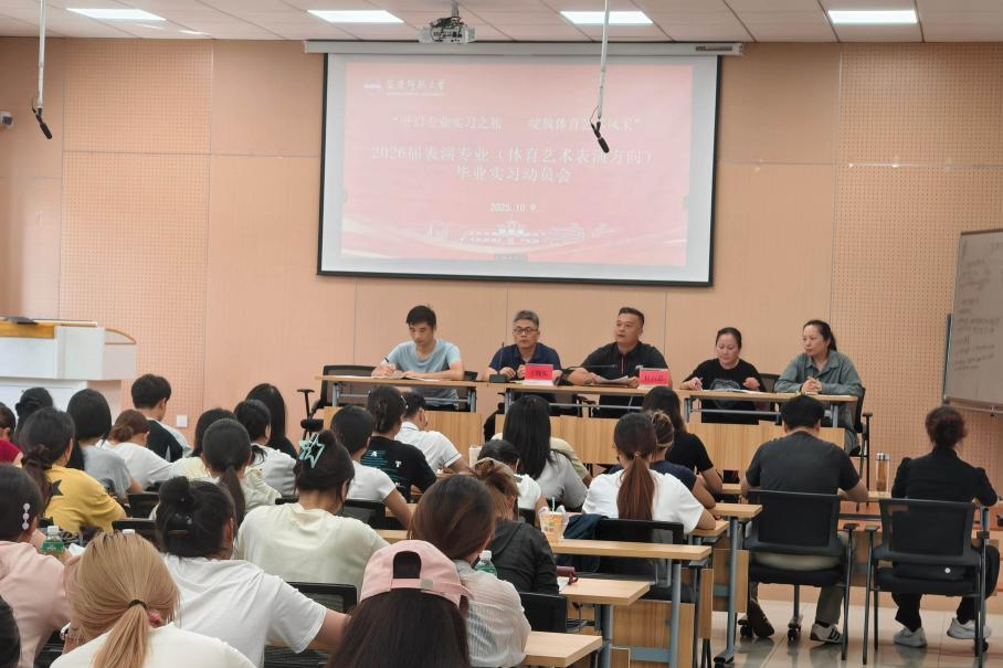 10月9日,英国上市公司365在体育馆多媒体教室召开2026届表演(体育艺术表演方向)专业毕业实习动员会议,旨在明确实习任务要求,强调安全纪律规范,部署实习保障措施。英国上市公司365副院长王晓东、副书记杜百忍、专业负责人潮芳、专职辅导员沈春华、实习秘书章京京及全体实习指导教师、2026届表演专业实习学生参加会议。