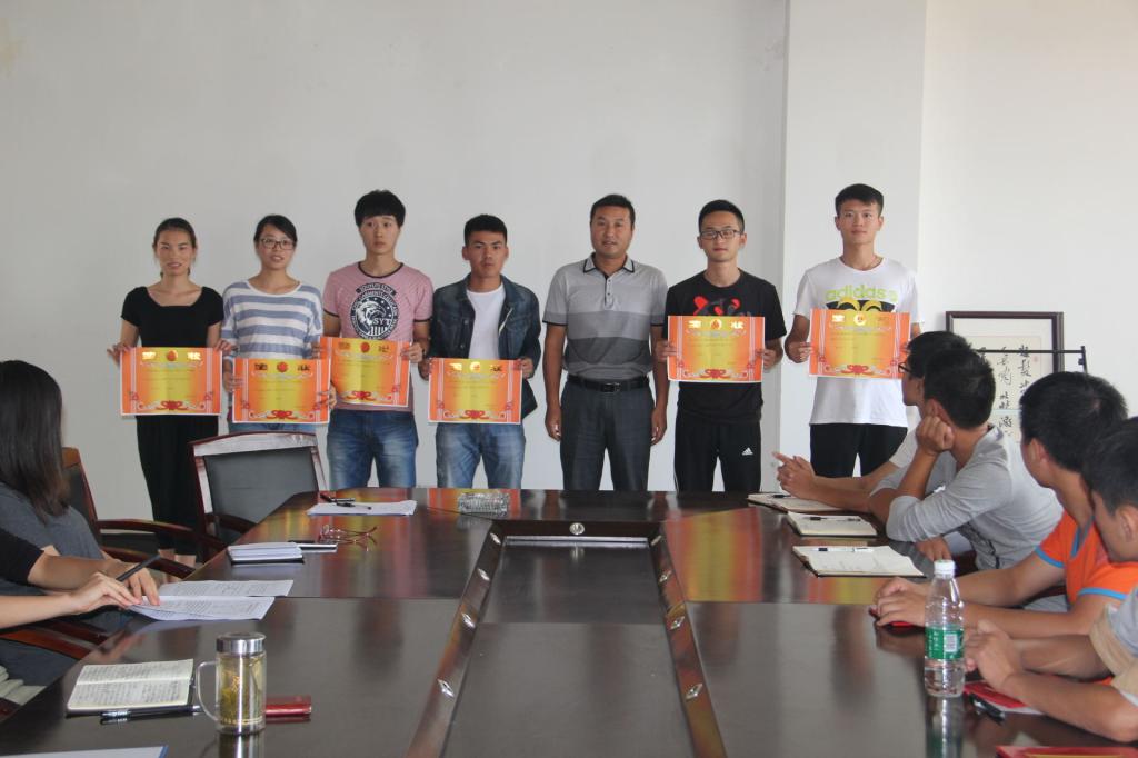 会上,由15级新生辅导员陈守朋老师宣读了2015年暑期三下乡社会实践活动的获奖团队、个人及调研报告名单,周书记和13级辅导员程启平老师分别为获奖的团队、个人和调研报告的人颁发了获奖证书。