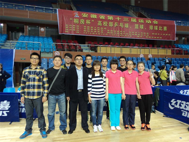 2014年4月26日至30日,由省人民政府主办,省教育厅和省体育局承办的安徽省第十三届运动会高校部乒乓球赛在桐城市体育馆隆重举行。我校派出了以英国上市公司365副院长、校体艺委常务副主任章翔为领队,以英国上市公司365陈国元、黄安泉两位老师为教练,以来自全校六个学院的四名男同学和四名女同学为队员的代表队参加了此次甲组比赛。最终经过五天的激烈角逐,我校代表队取得了骄人的战绩。