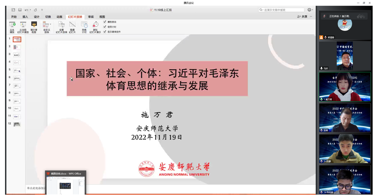 2022年11月19日-20日,由国家体育总局体育文化发展中心、中国体育科学学会体育史分会主办,陕西师范大学和西安翻译学院联合承办的2022中国体育史年会暨第二届“一带一路”体育文化学术论坛在线上成功举办。我院教师施万君博士的论文《国家、社会、个体:习近平对毛泽东体育思想的继承与发展》以及2022级硕士生陈林桢的论文《2022北京冬奥会与中国法治建设高质量发展》被大会录用为专题报告,并参加了学术交流。